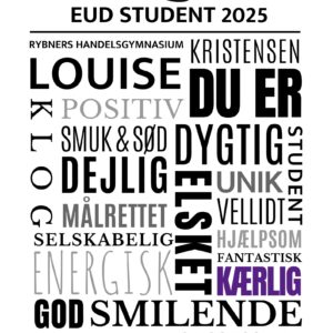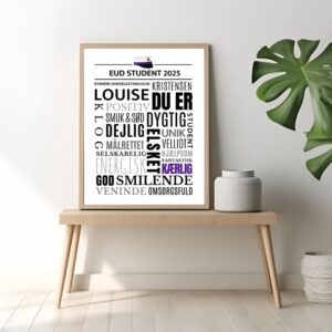 Sød og dekorativ studenterplakat, med en masse søde ord studentens navn samt skolens navn.