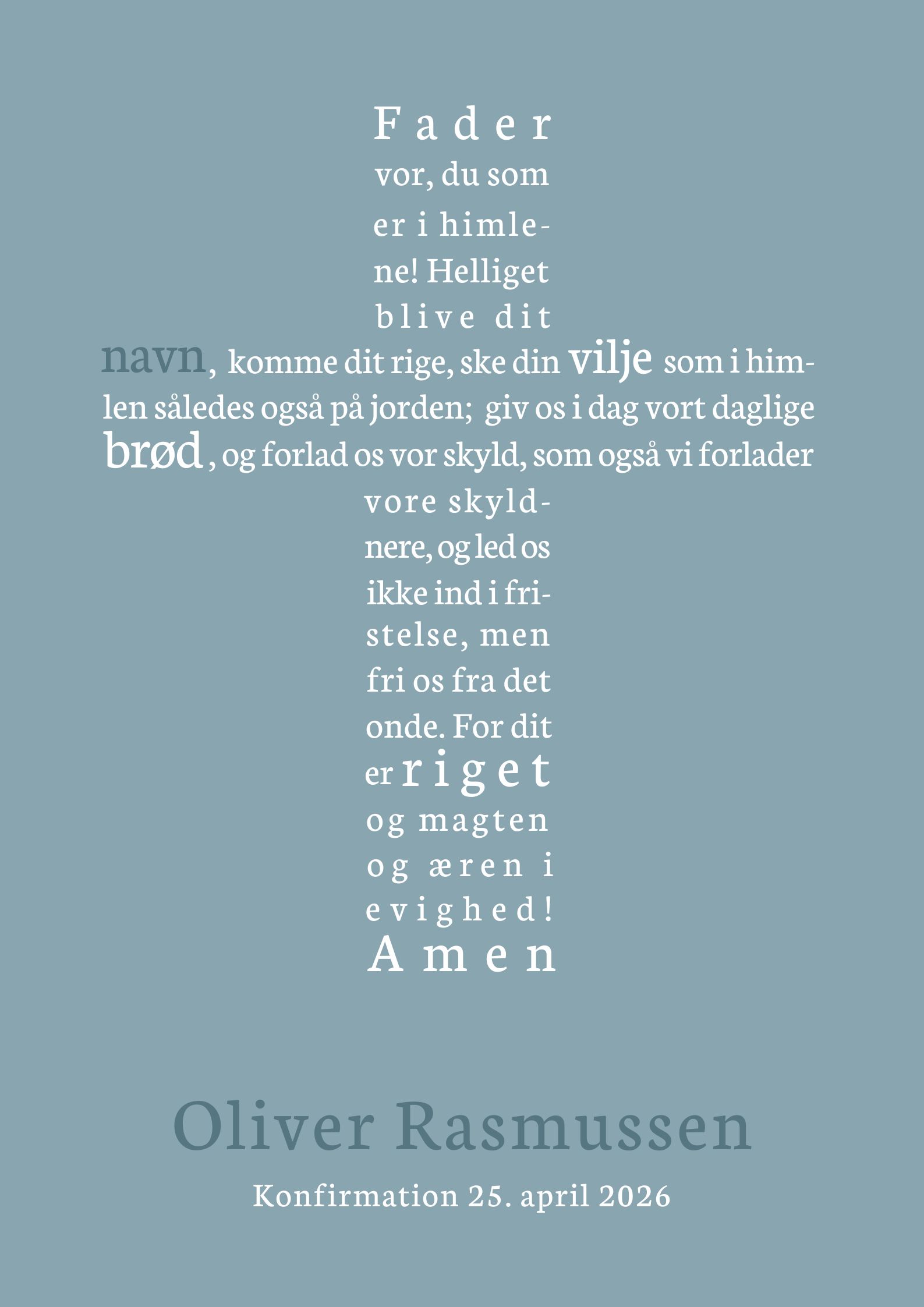 Fader vor, formet af teksten som et kors. med konfirmandens navn og konfirmationsdato skrevet i bunden.