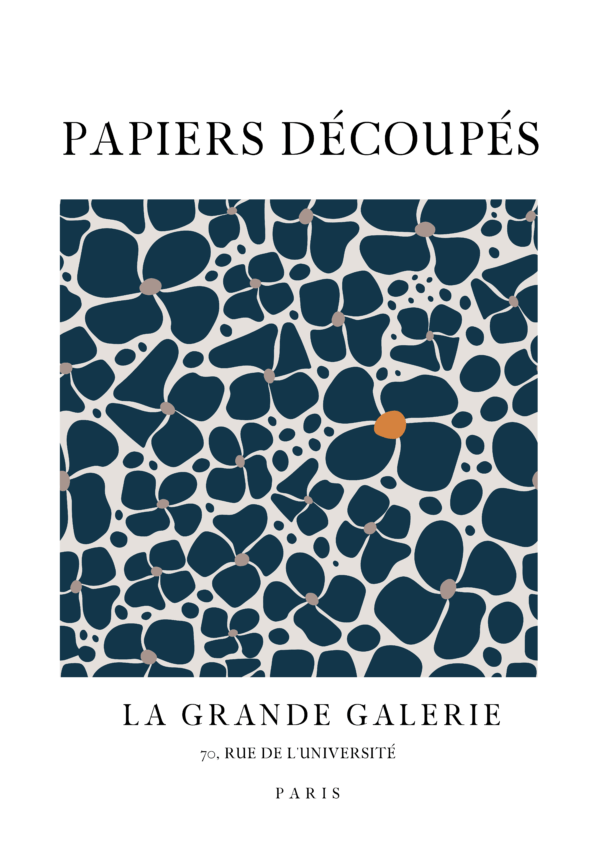 Abstrakt grafisk illustration med mørkeblå blomster, inspireret af den franske kunstner Henri Matisse