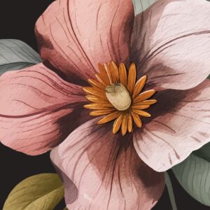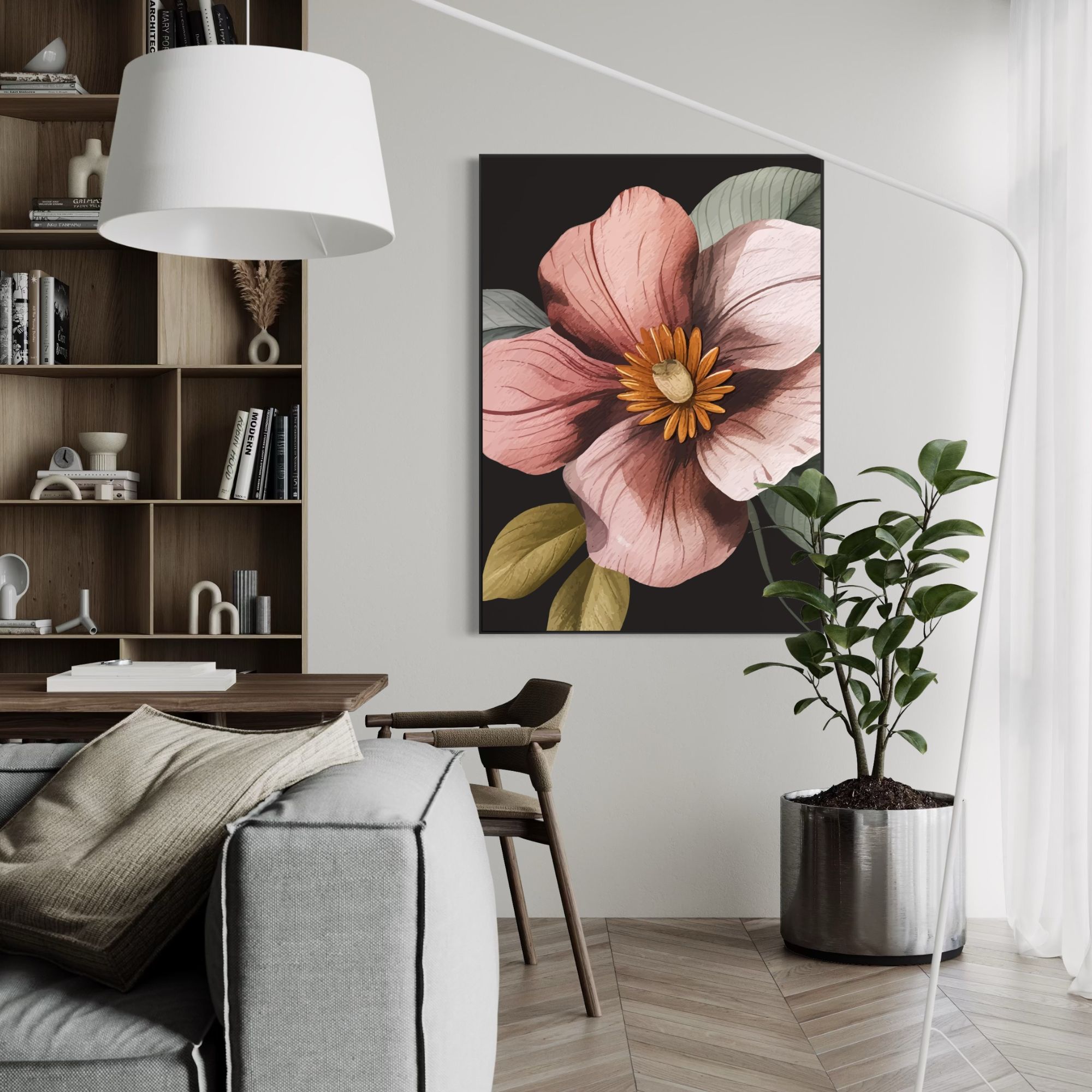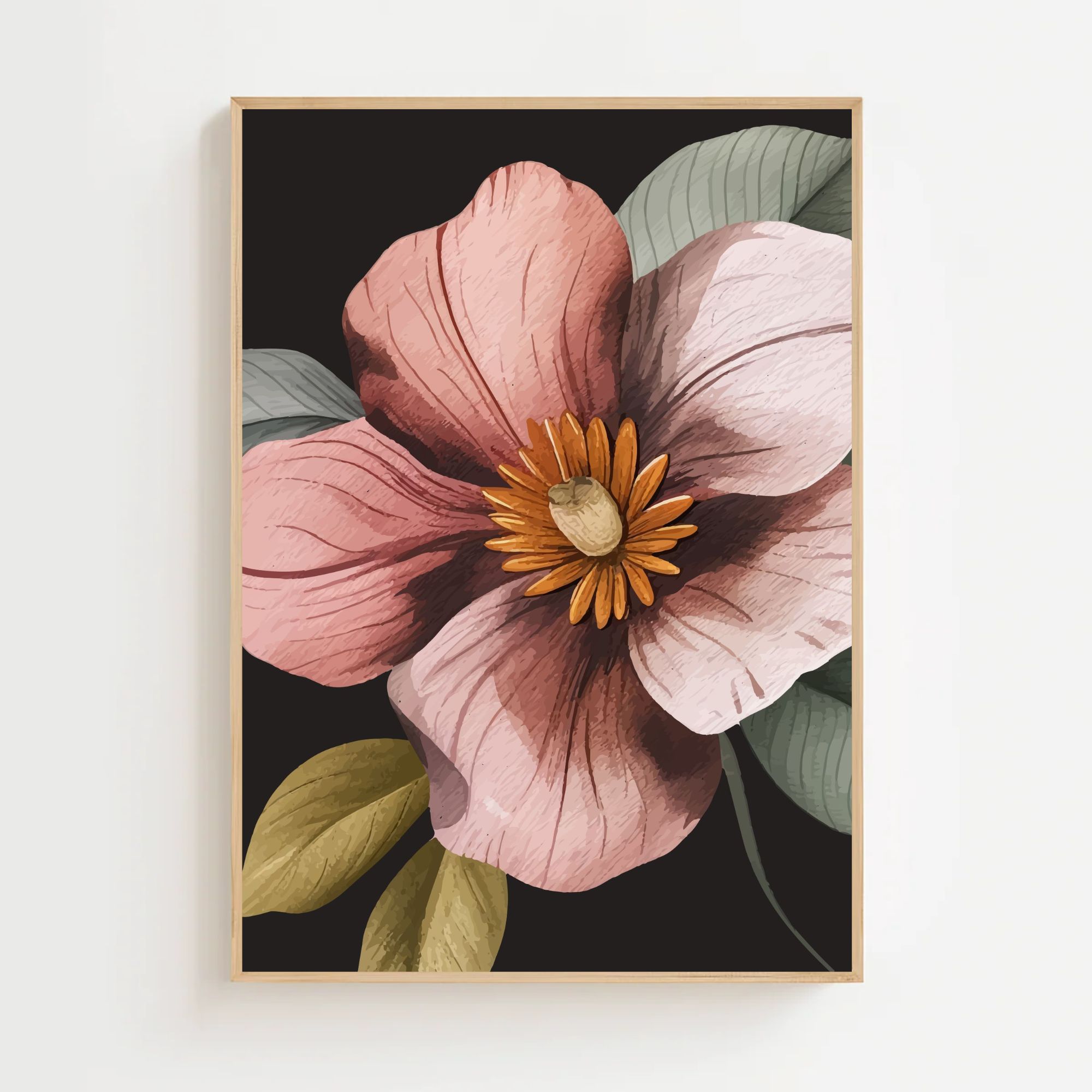 Smuk plakat med en elegant, håndtegnet blomst i bløde rosa nuancer og varme, gyldne detaljer. Det kunstneriske udtryk kombinerer naturens ro med moderne stil, hvilket gør den perfekt til stuen, soveværelset eller kontoret. Ideel til dig, der ønsker at skabe en harmonisk og stilfuld indretning med et botanisk touch.