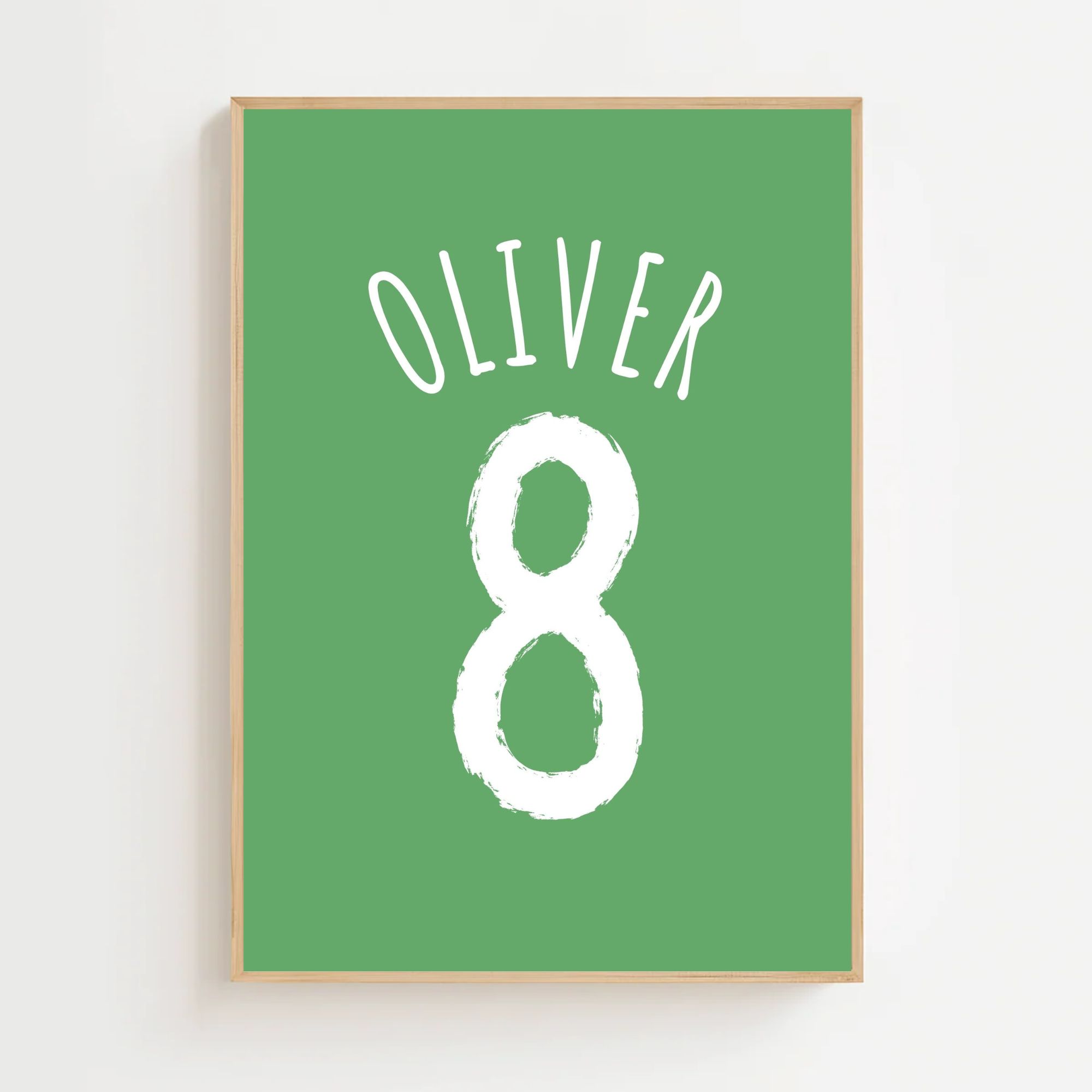 Skab en hyggelig og personlig stemning med denne stilrene plakat med barnets navn og trøjenummer på grøn baggrund. Perfekt som fødselsdagsgave, navneplakat eller dekoration til børneværelset. Det enkle, håndtegnede design i hvid giver et moderne og legende udtryk, der passer ind i både drengeværelse og pigeværelse. En personlig plakat er en unik gaveidé til børn.