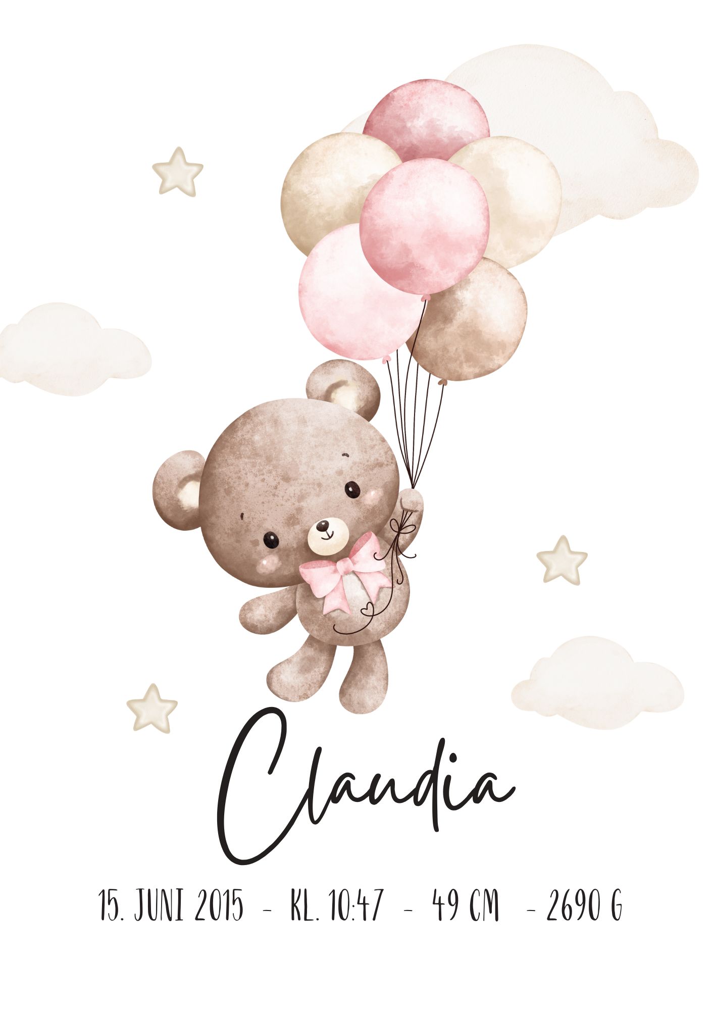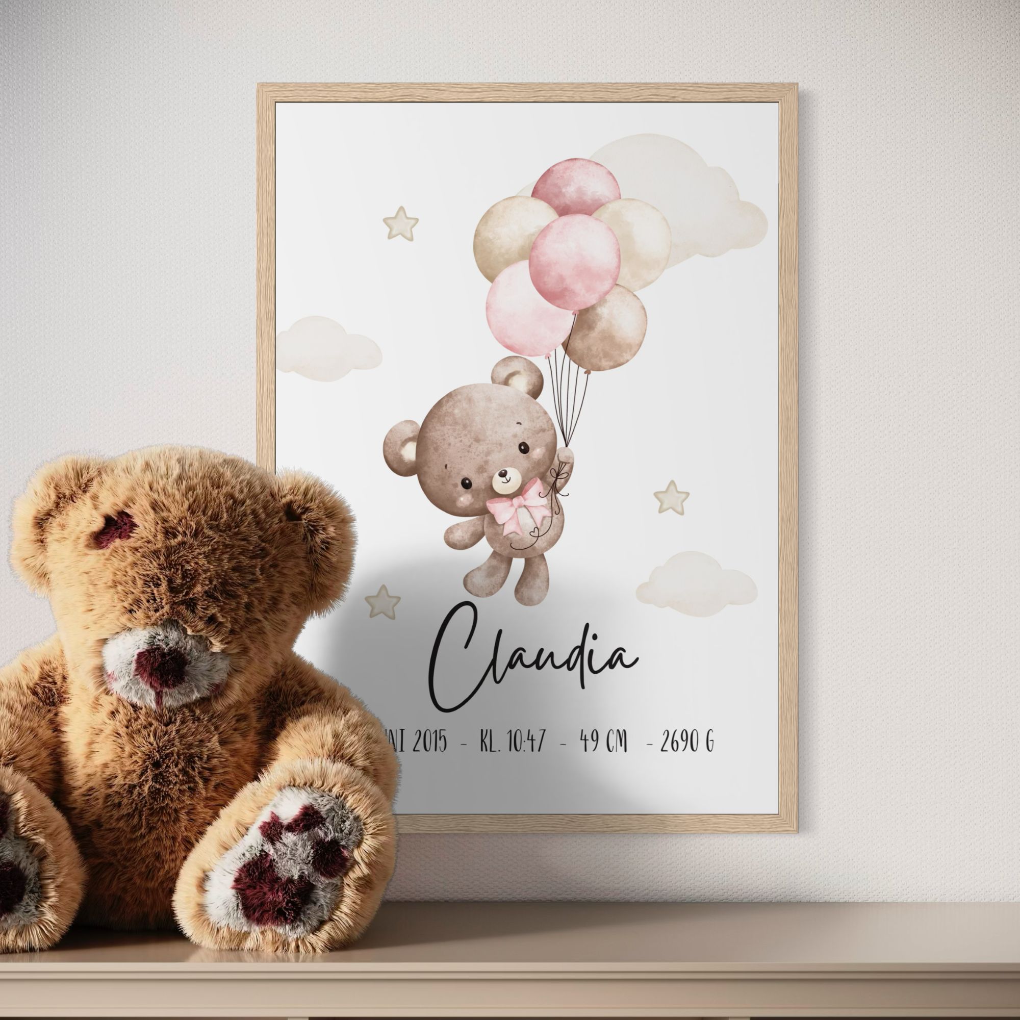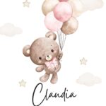 Sød fødselstavle med motiv af en bamse som flyver med balloner og med barnets fødselsinformationer