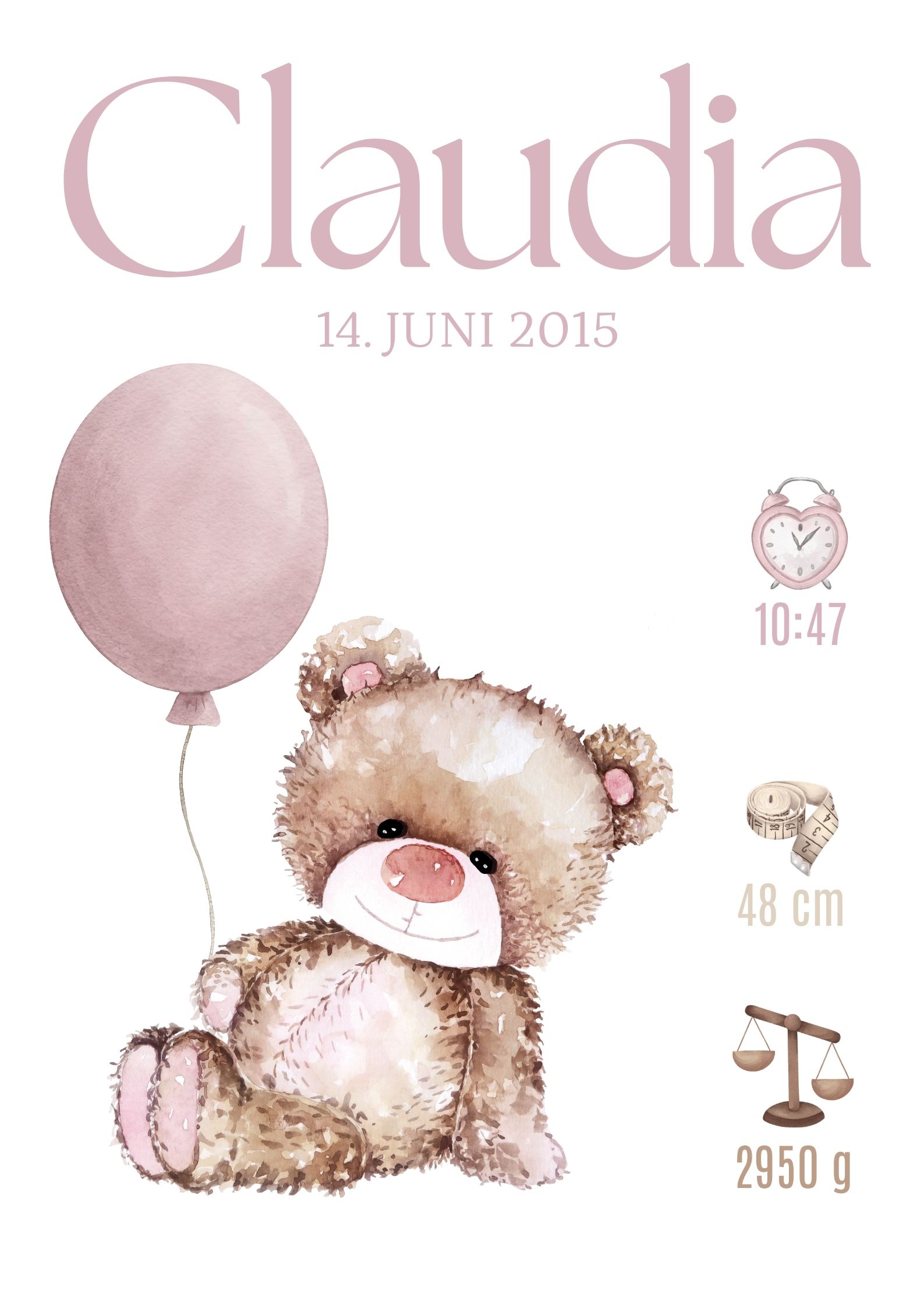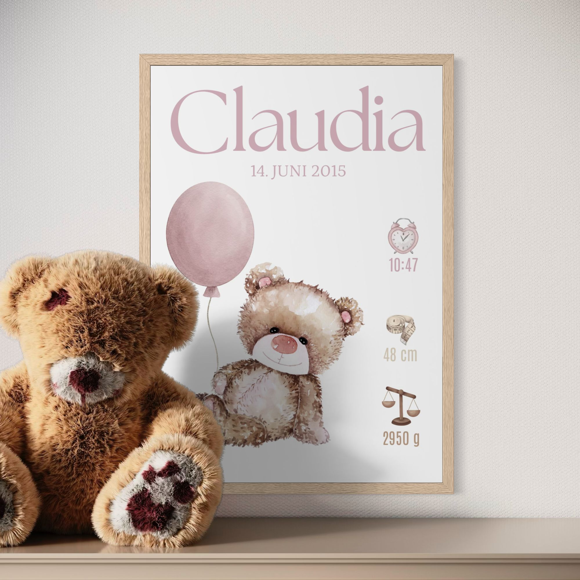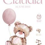 Sød fødselstavle med motiv af en bamse som holder en ballon og med barnets fødselsinformationer