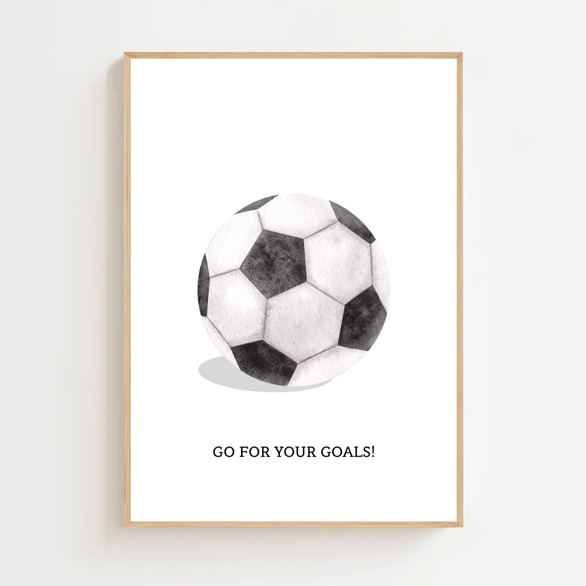 Stilren plakat med klassisk fodboldmotiv og teksten “Go for your goals!”. Perfekt til børneværelset, teenageværelset eller sportsinteresserede, der elsker fodbold og motivation. Det enkle sort-hvide design passer ind i moderne indretning og minder dig om at gå efter dine mål, både på banen og i livet. En oplagt gaveidé til fodboldspillere og fans.