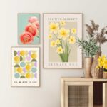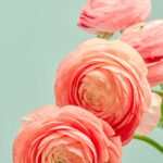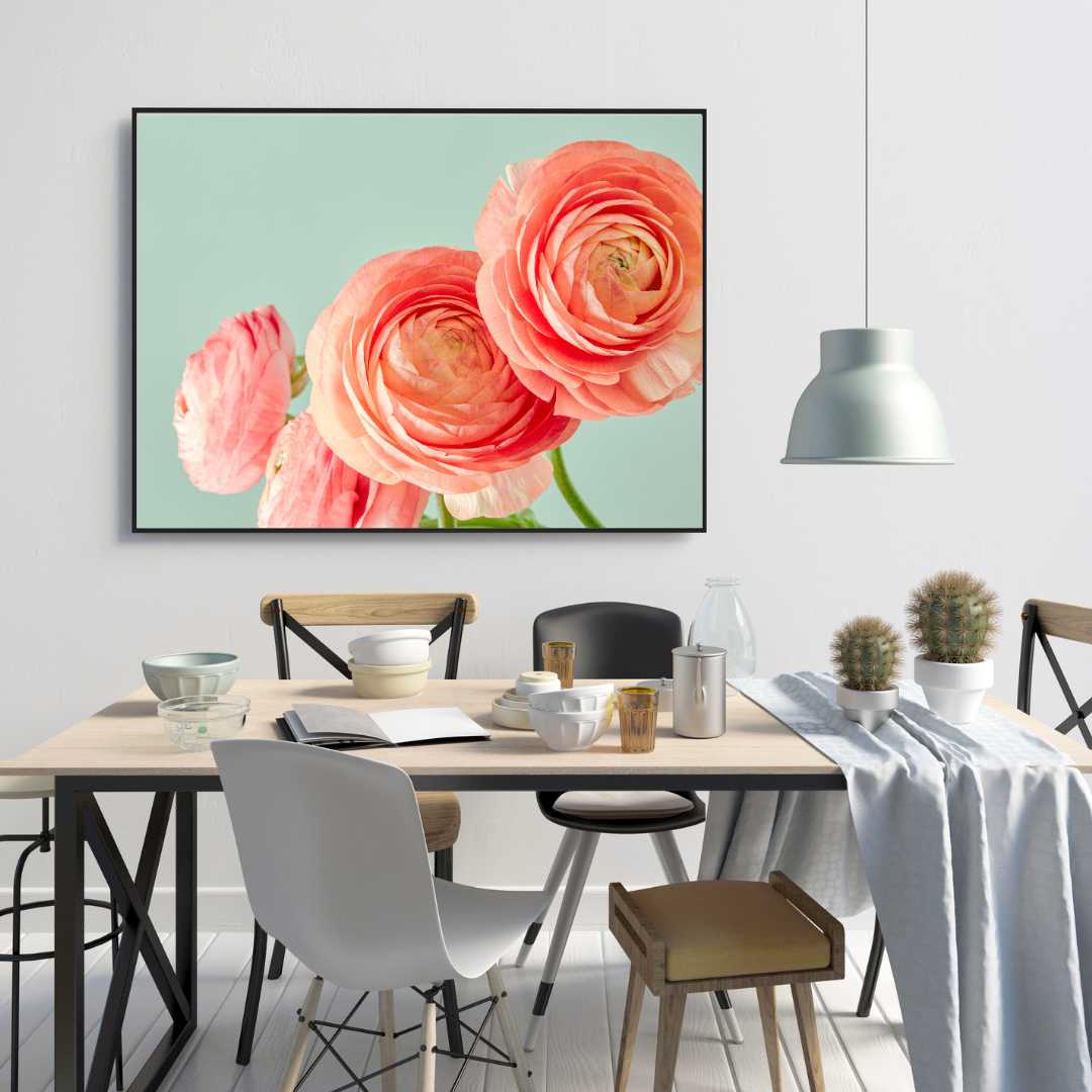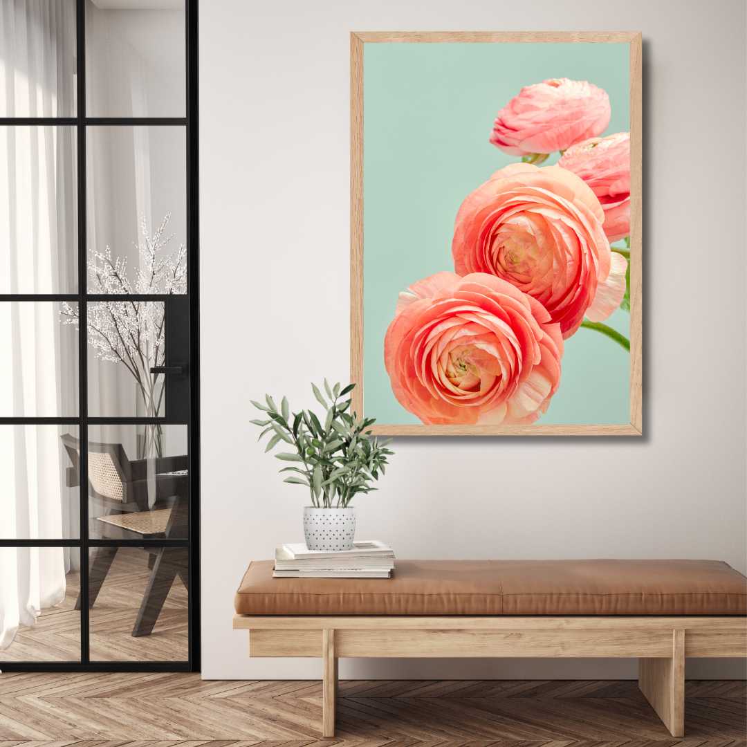 Utrolig populær blomster vægkunst med motiv af en laksefarvet Ranunkel på en turkis baggrund