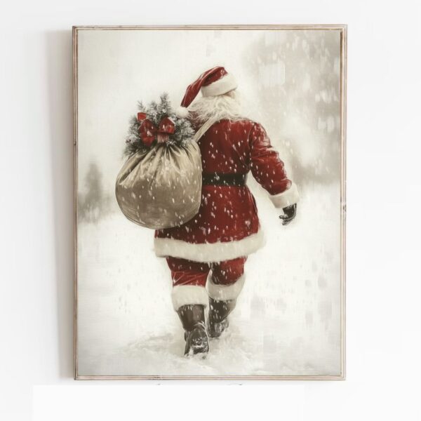 Juleplakat med motivet af julemanden som går i et vinterlandskab