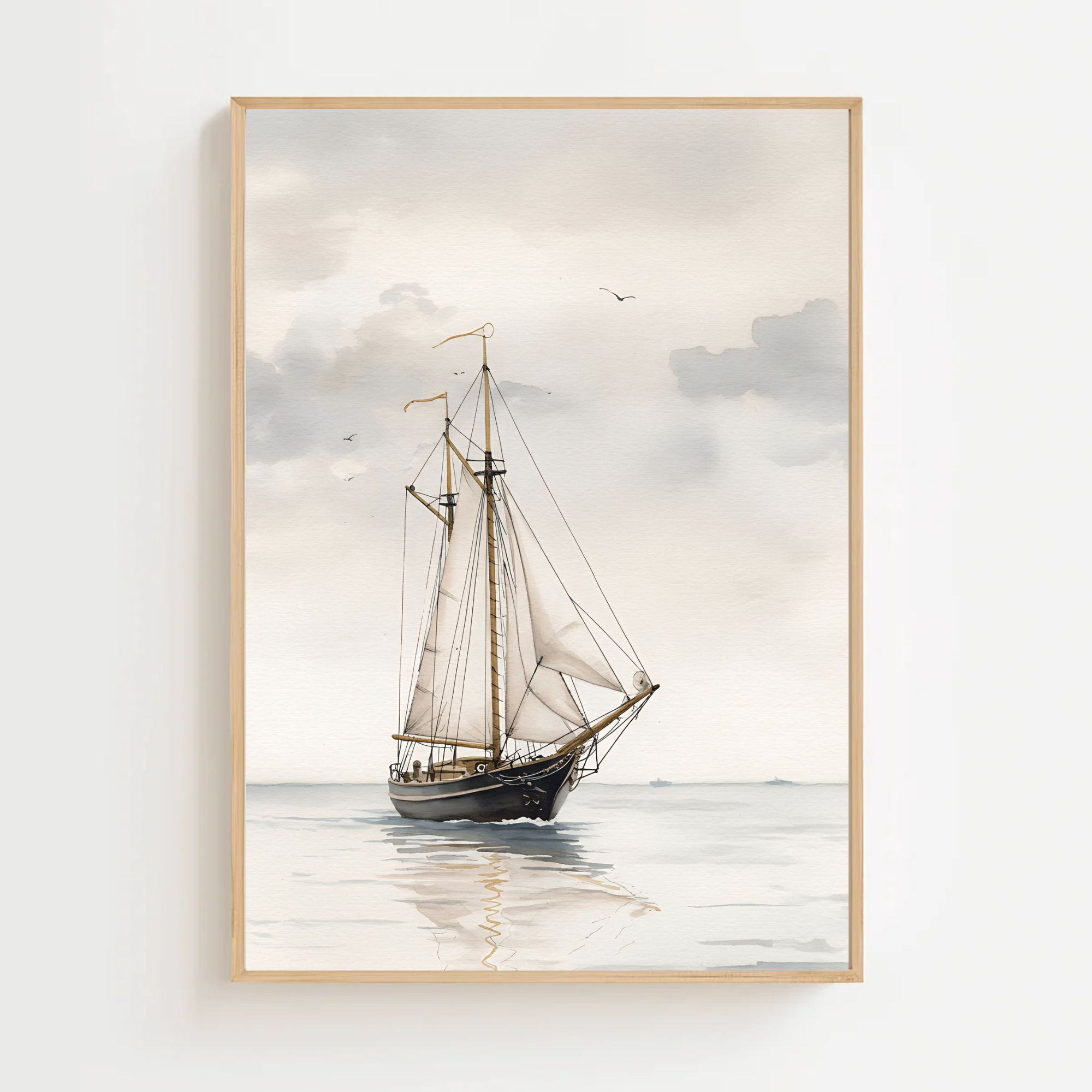 Elegant plakat med en klassisk sejlbåd på roligt hav i bløde, afdæmpede farver. Motivet skaber en rolig og maritim stemning, perfekt til stuen, soveværelset eller sommerhuset. Ideel til dig, der elsker havet, sejlads og nordisk, minimalistisk indretning. Et tidløst kunsttryk, der tilfører lethed og harmoni til dit hjem.