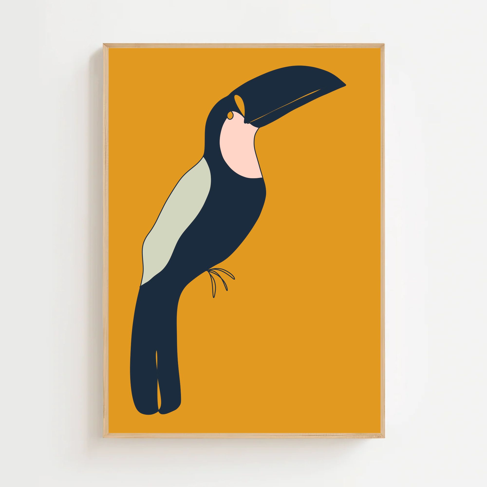 Moderne minimalistisk plakat med motiv af en tukan med en gul baggrund
