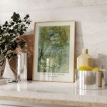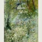 Grøn have med små farverige blomster ved en flod. Plakaten har teksten “Vincent Van Gogh. River Bank in Springtime. 1887.” under billedet.