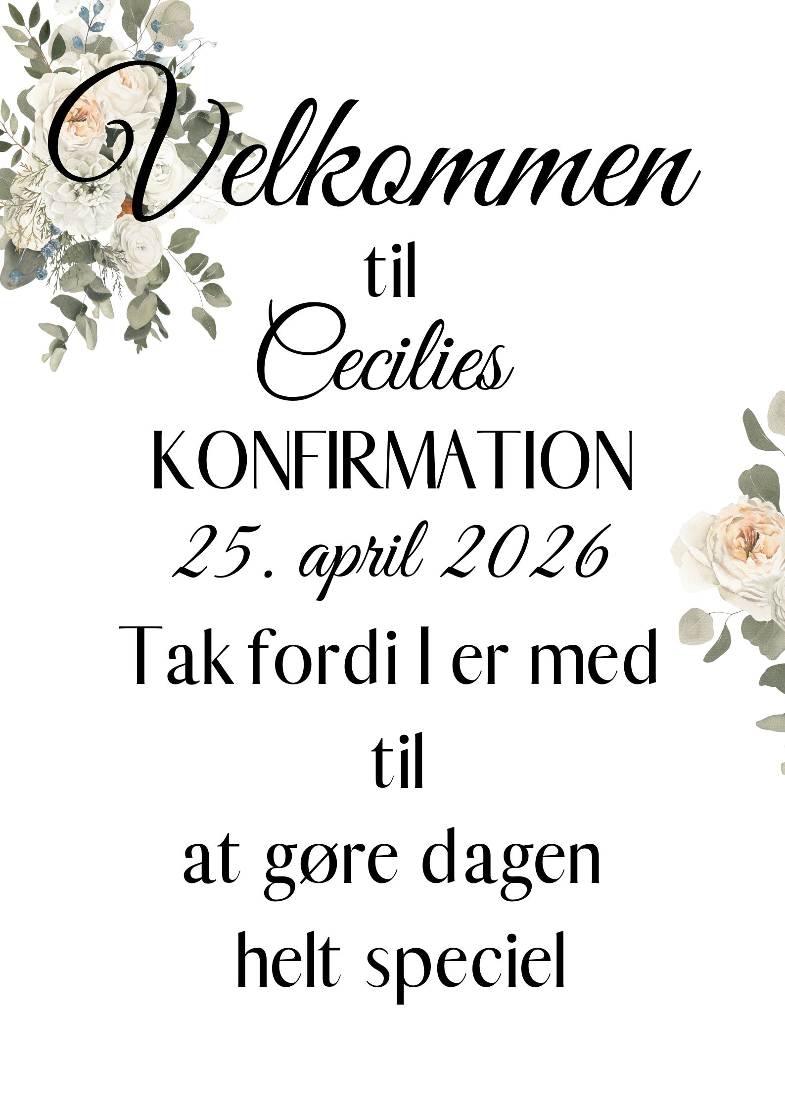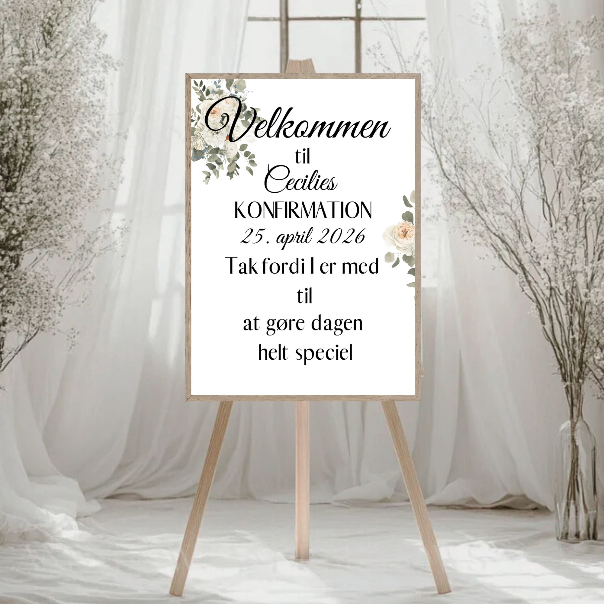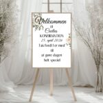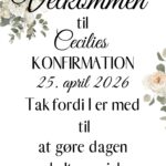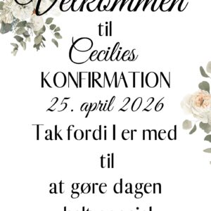 Dekorativ velkomstplakat til konfirmationen, kan evt. bruges ved indgangen eller på gavebordet.