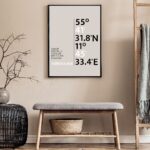Personlig plakat, der viser koordinaterne på adressen samt navnene på familien.